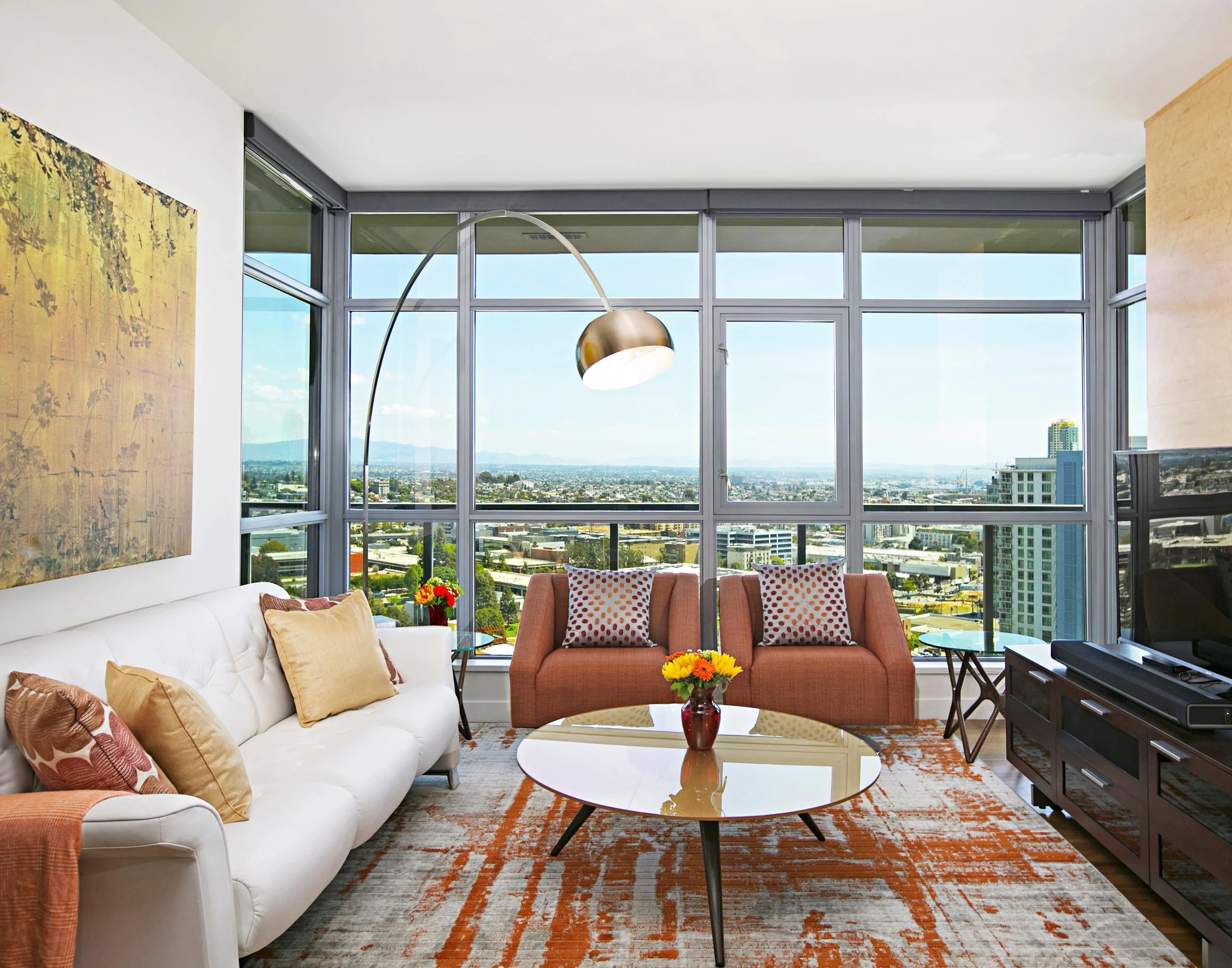 M.A.P. INTERIORS CREATED AN AIRY, OPEN FLOOR PLAN AND ATMOSPHERE USING LIGHT COLORS AND A CONTEMPORARY STYLE COUPLED WITH REFERENCES TO JAPANESE CULTURE WITH PIECES SUCH AS AN ANTIQUE CHEST AND ARTWORK ALONG WITH SIMPLICITY OF LINES. THE COLOR PALETTE IS MOSTLY NEUTRAL WHITE WITH DASHES OF ORANGE AND YELLOW HUES AS A BACKDROP FOR THE BREATHTAKING VIEWS ON DOWNTOWN AND BALBOA PARK, THE OBVIOUS CENTER OF THE DESIGN SCHEME.