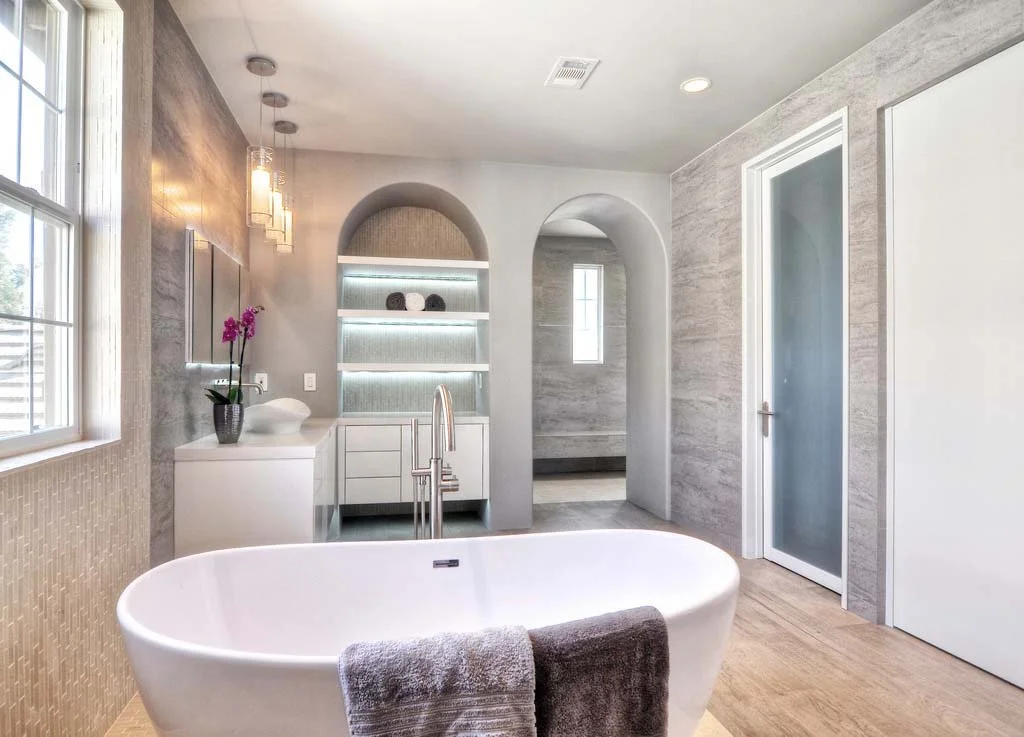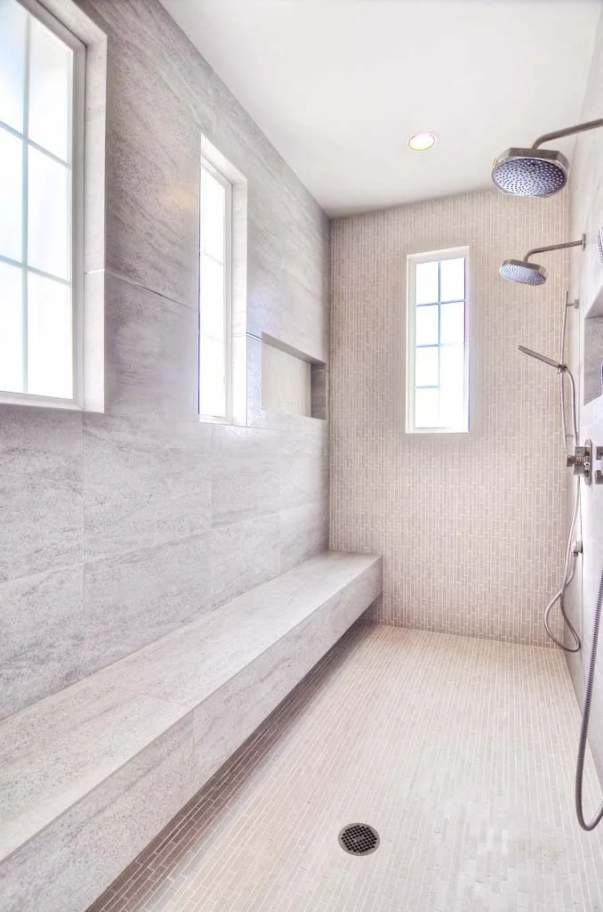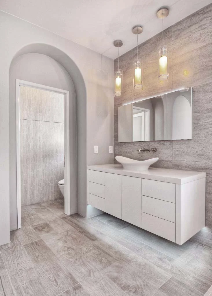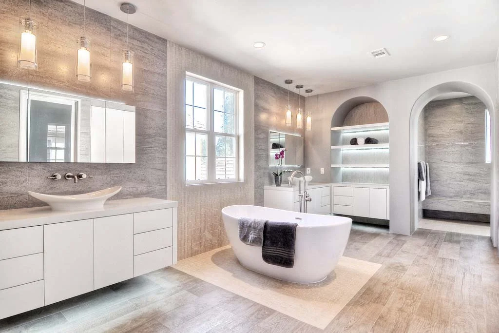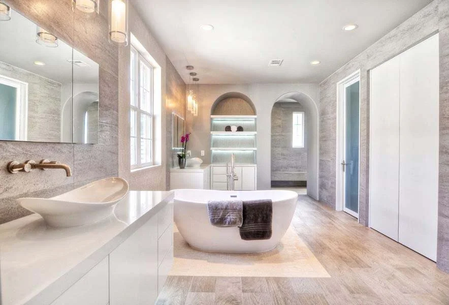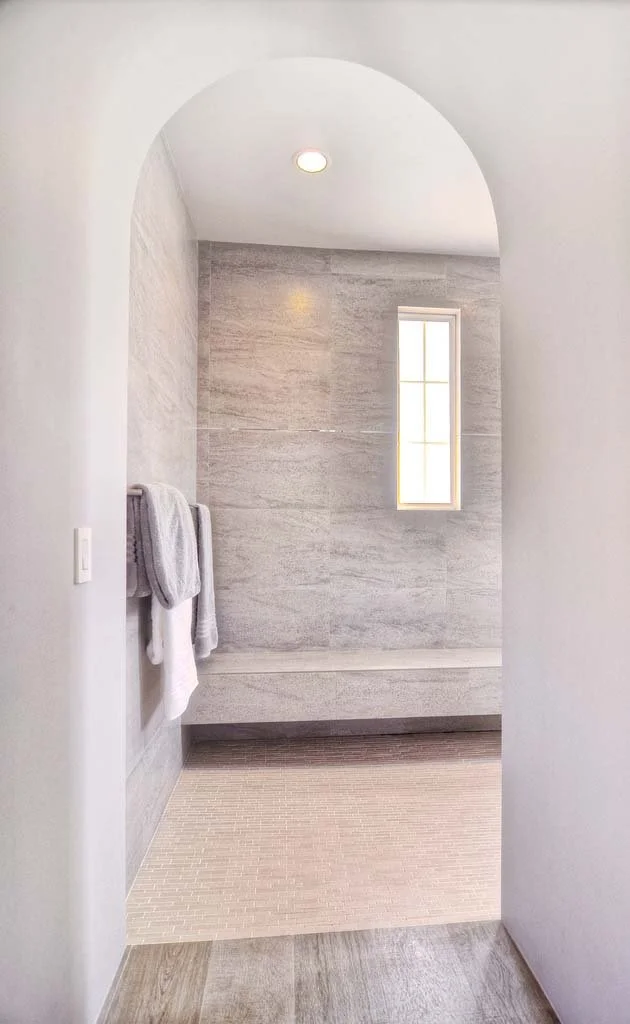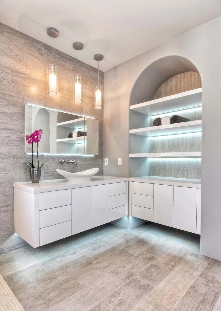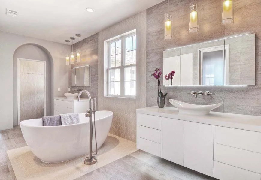 THE ONLY WAY TO CREATE THE SERENE MASTER BATH WAS TO START FROM SCRATCH. M.A.P. INTERIORS PRODUCED A NEW FLOOR PLAN AND OVERALL DESIGN SCHEME THAT INCLUDED THE CUSTOM DESIGN OF THE FLOATING VANITIES AND OTHER BUILT-INS.
