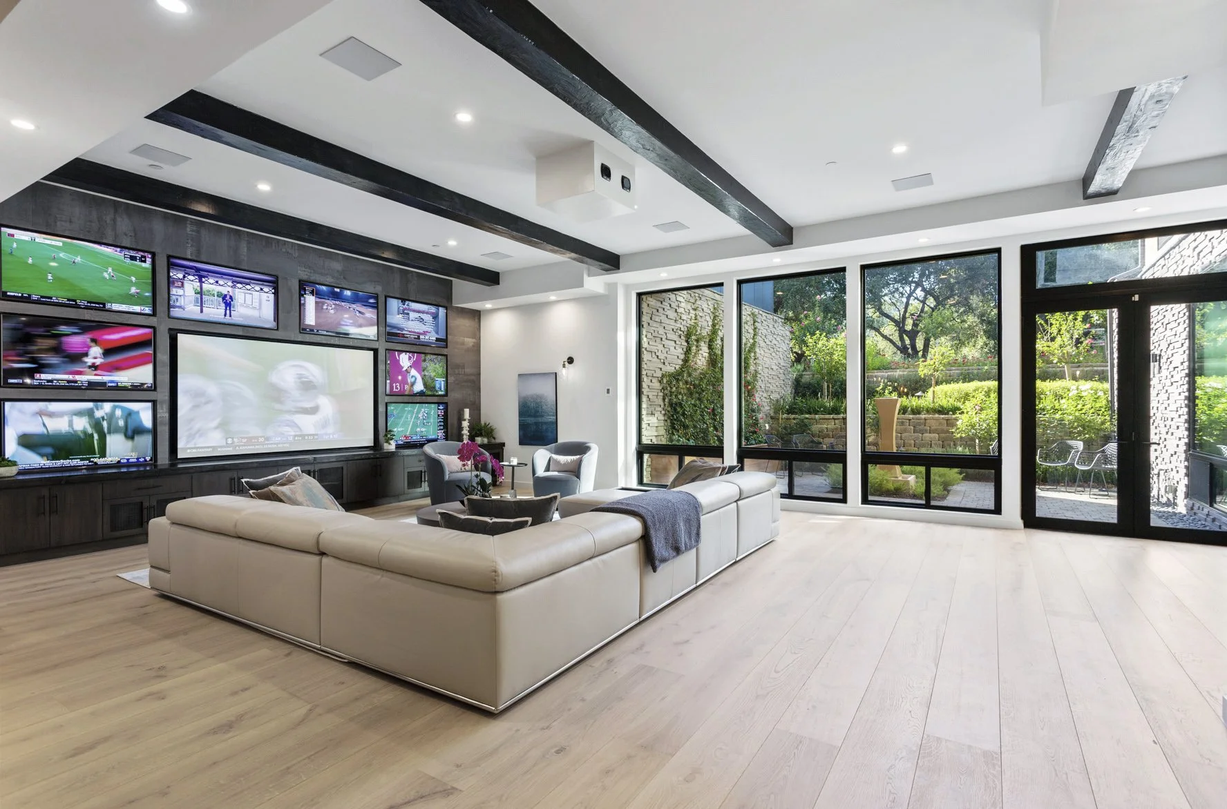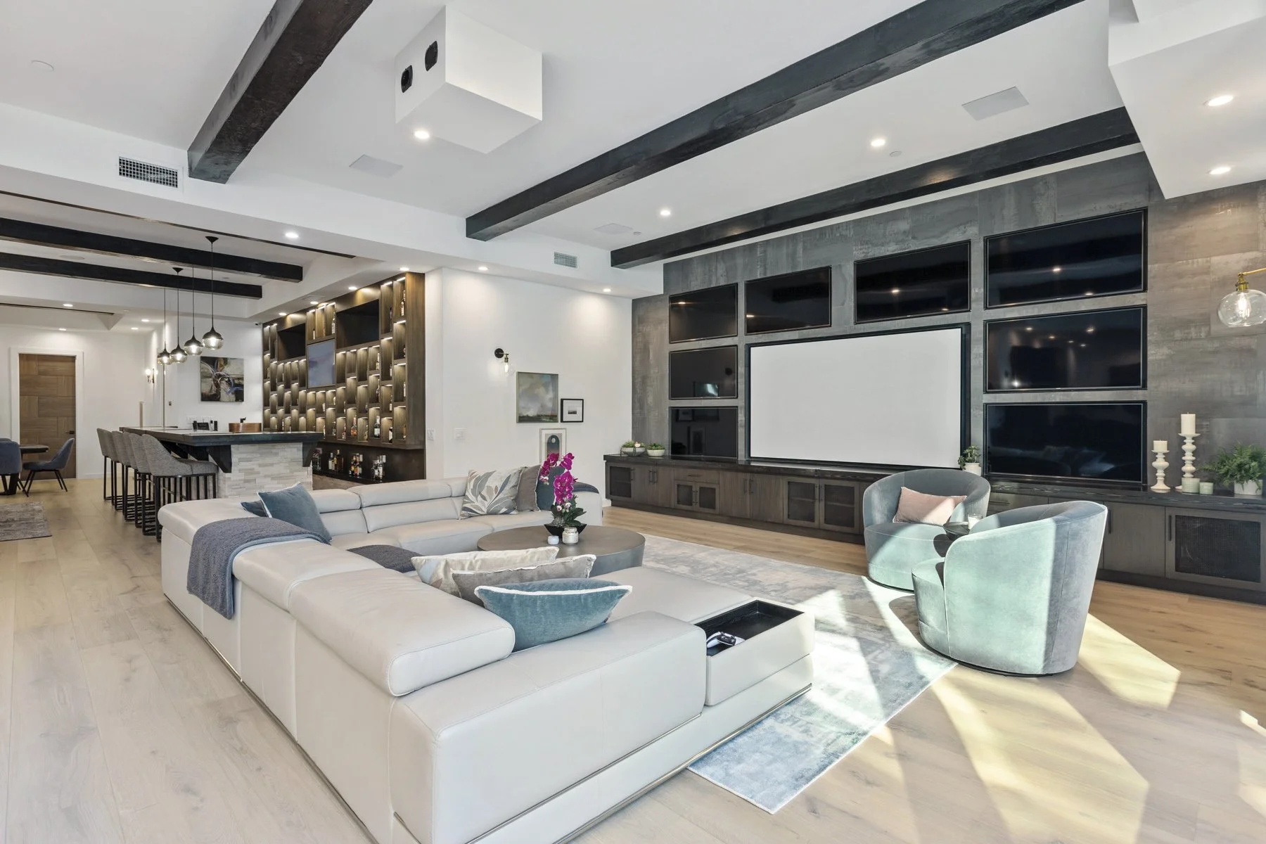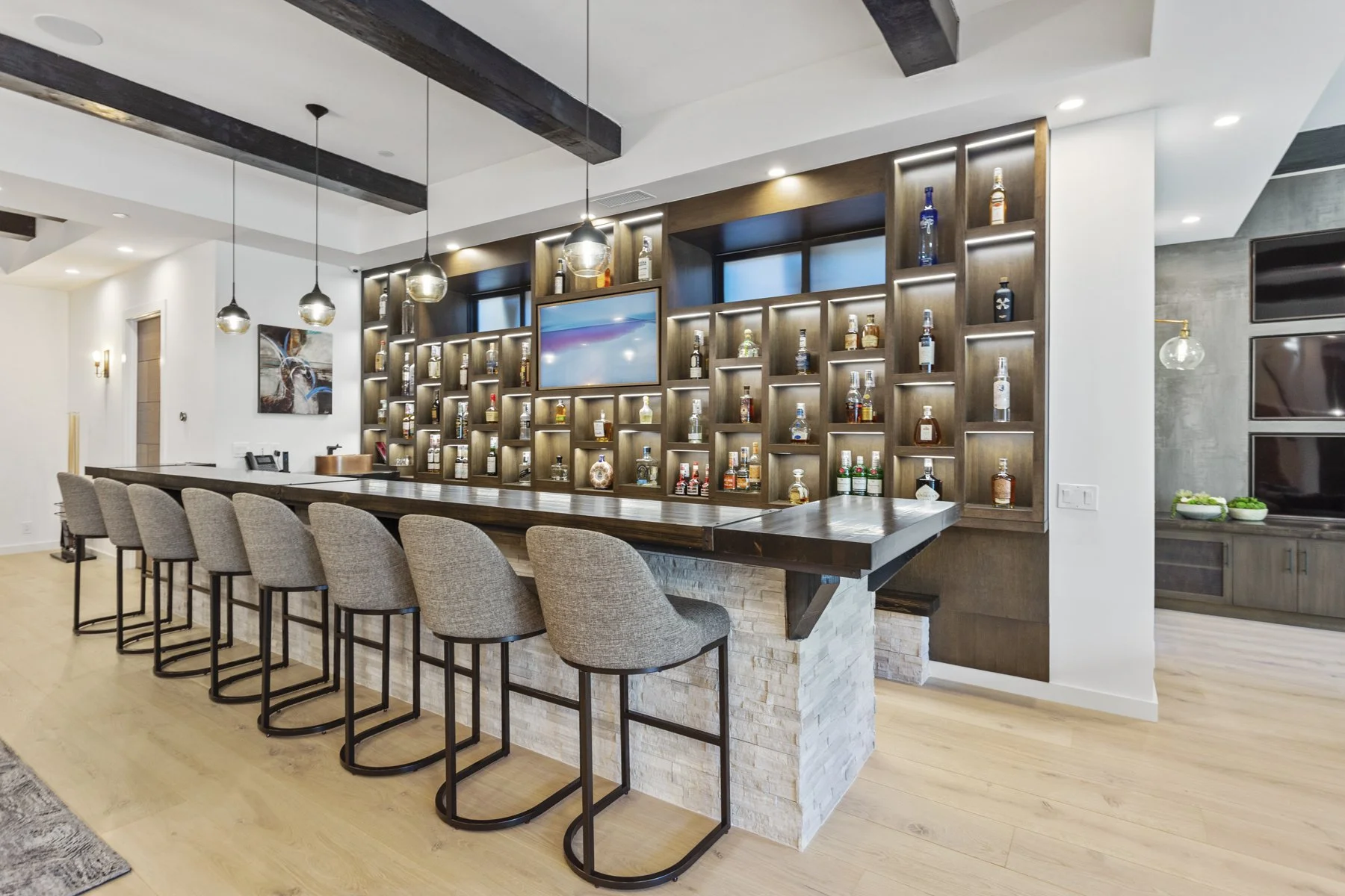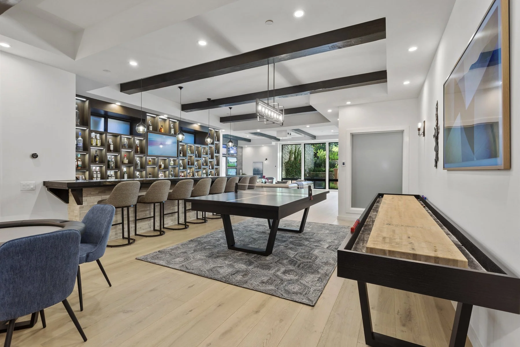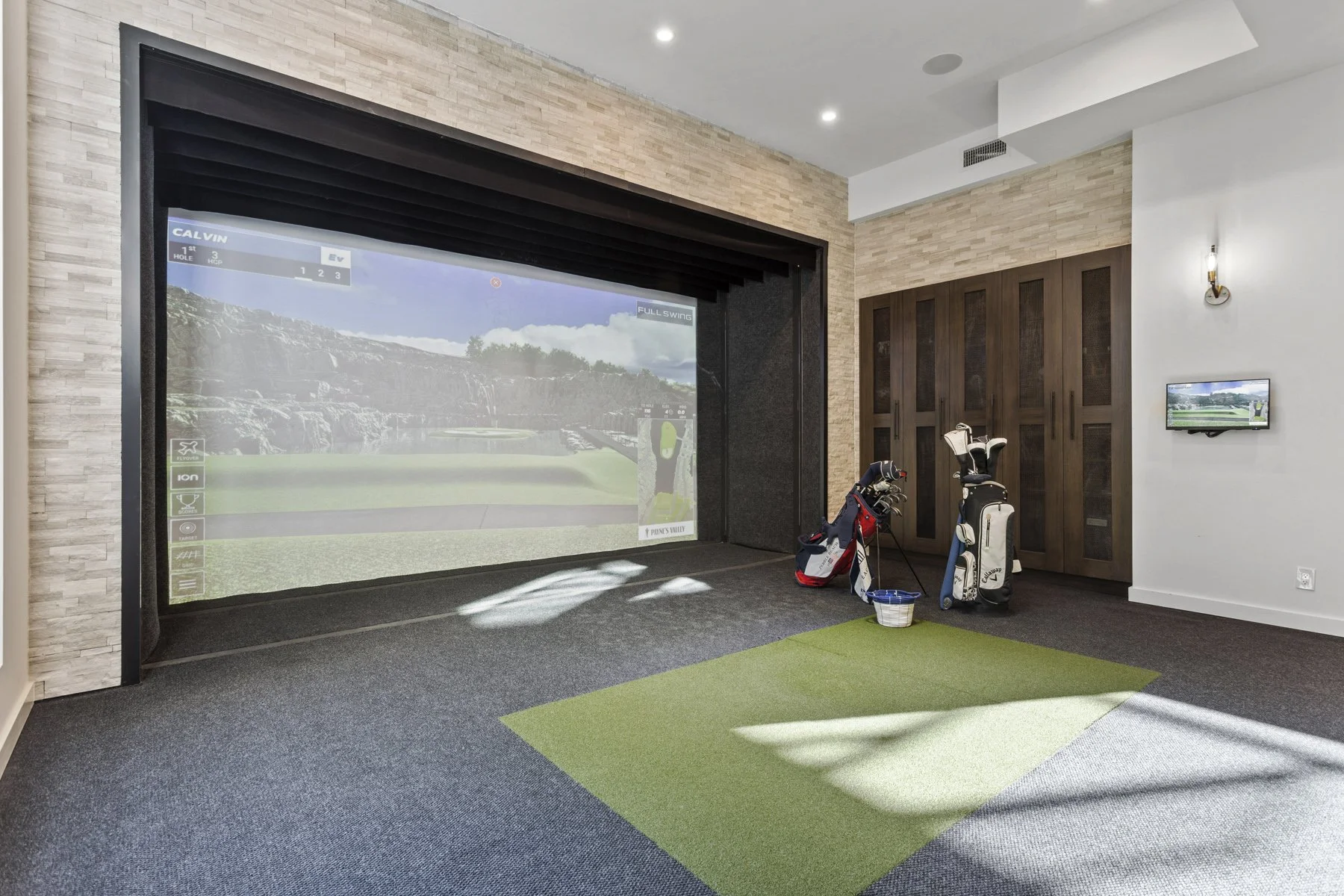 THIS IS THE BASEMENT LEVEL DISPLAYING THE MOTTO OF SPORTS AND ENTERTAINMENT, WITH ITS PLAY AND GAMING AREA, LARGE BAR, TV LOUNGE WITH MULTIPLE SCREENS , GOLF SIMULATOR, GYM ROOM, AND OUTDOOR BBQ AREA.