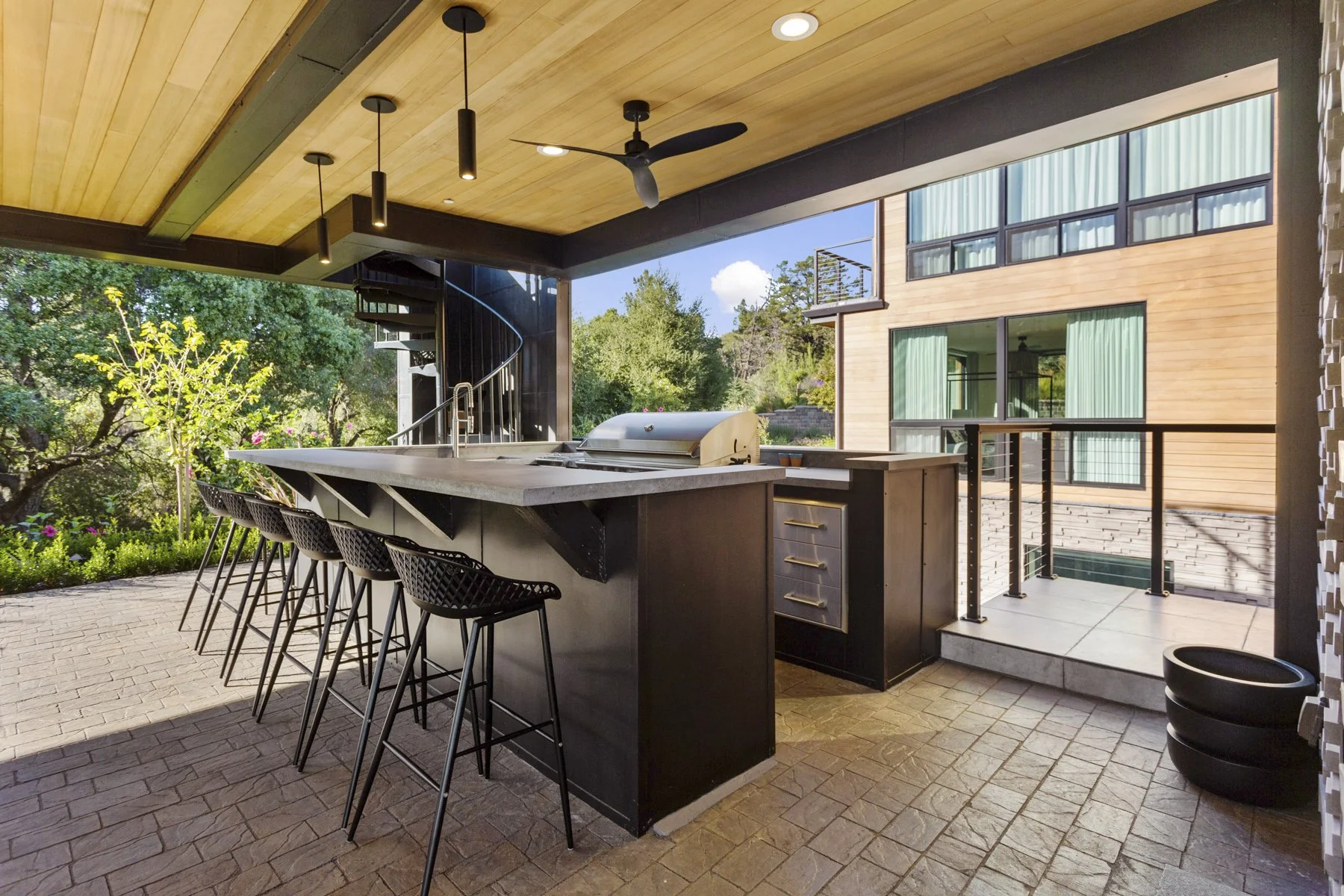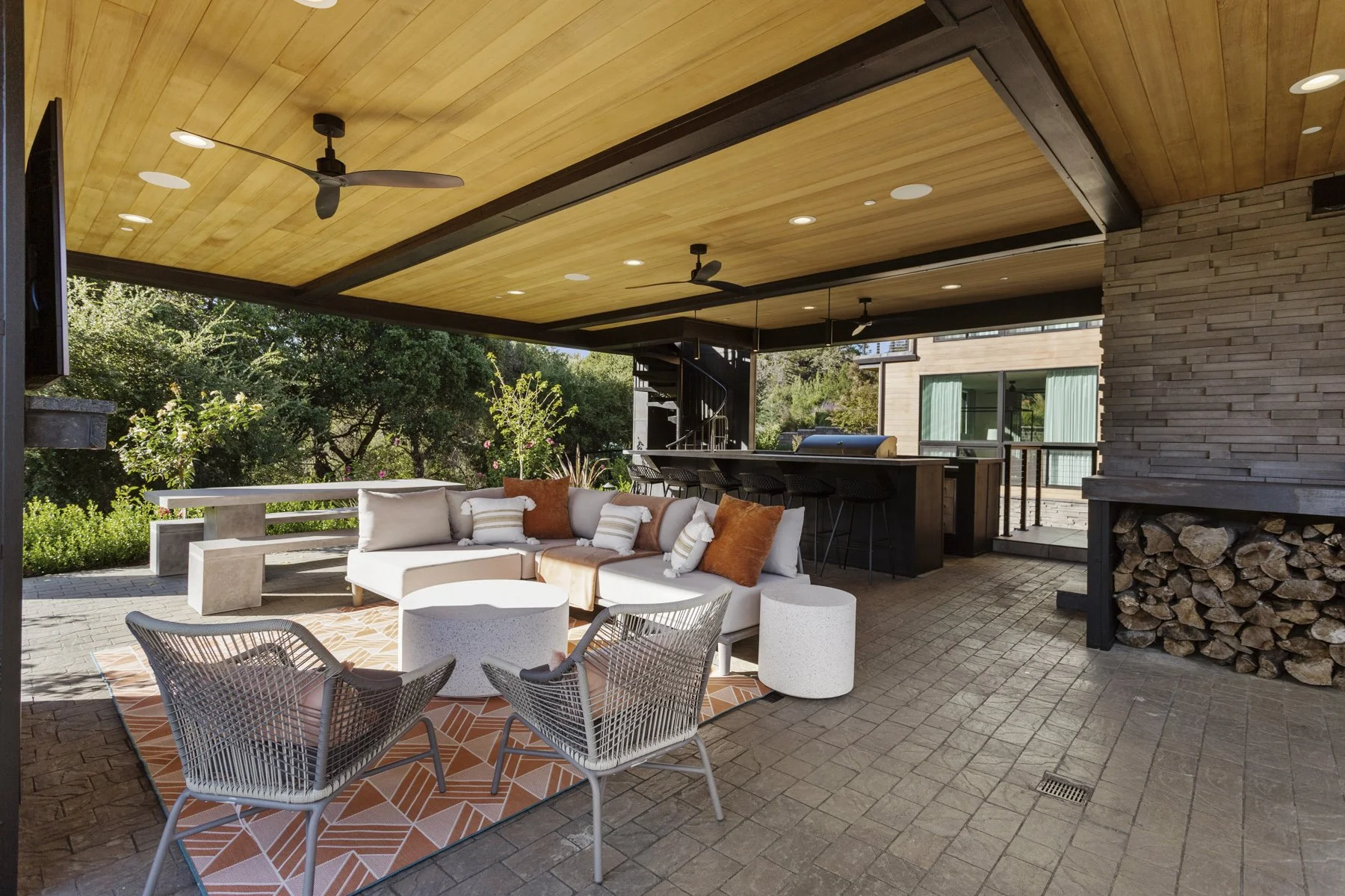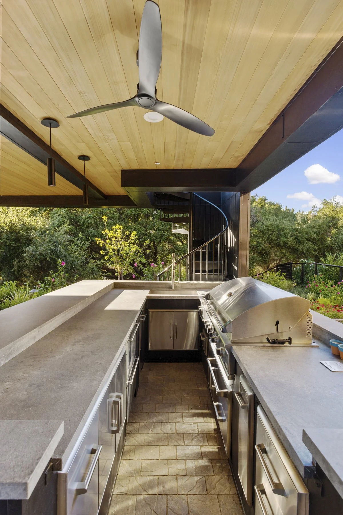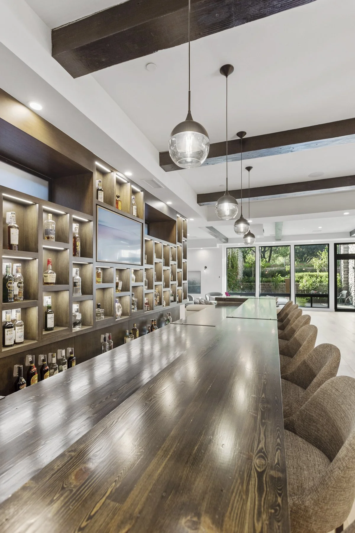SYLVIA BEEZ CUSTOM-DESIGNED THE KITCHEN AND ALL OF THE 10 BATH- AND POWDER ROOMS, AS WELL AS THE GUEST HOUSE THAT IS LOCATED AWAY FROM THE MAIN HOUSE IN A PARK-LIKE SETTING. FURTHERMORE, SHE DESIGNED THE FIREPLACES, THE MILLWORK, THE BUILT-INS, AND THE LIGHTING, AND CHOSE THE LAYOUT AND SELECTION OF ALL FURNISHINGS, ARTWORK, AND DECOR. FOR THE OUTDOOR SPACES, SHE LAYED OUT AND SELECTED FURNITURE AS WELL AS THE VARIOUS FIRE- AND WATER FEATURES.