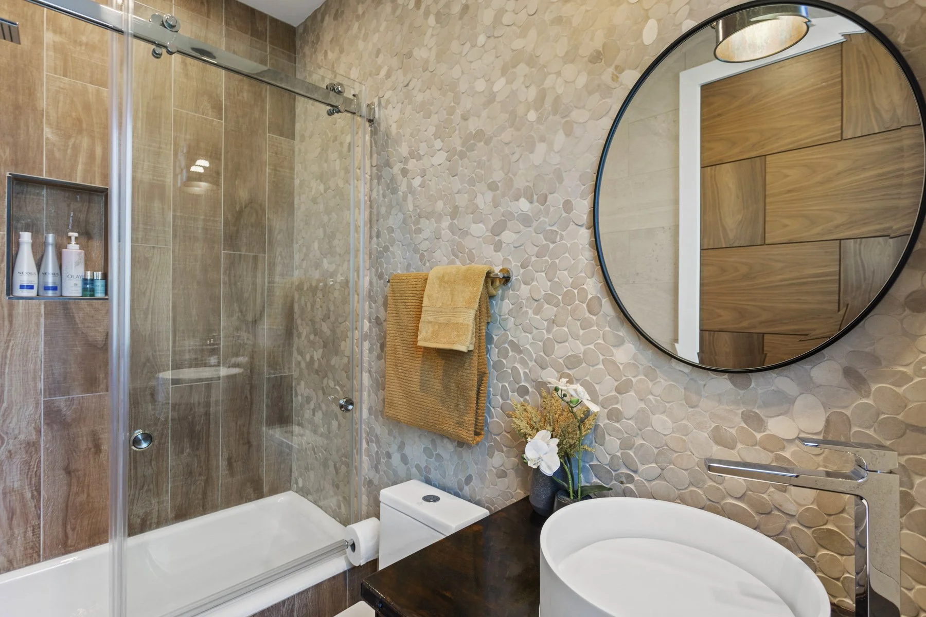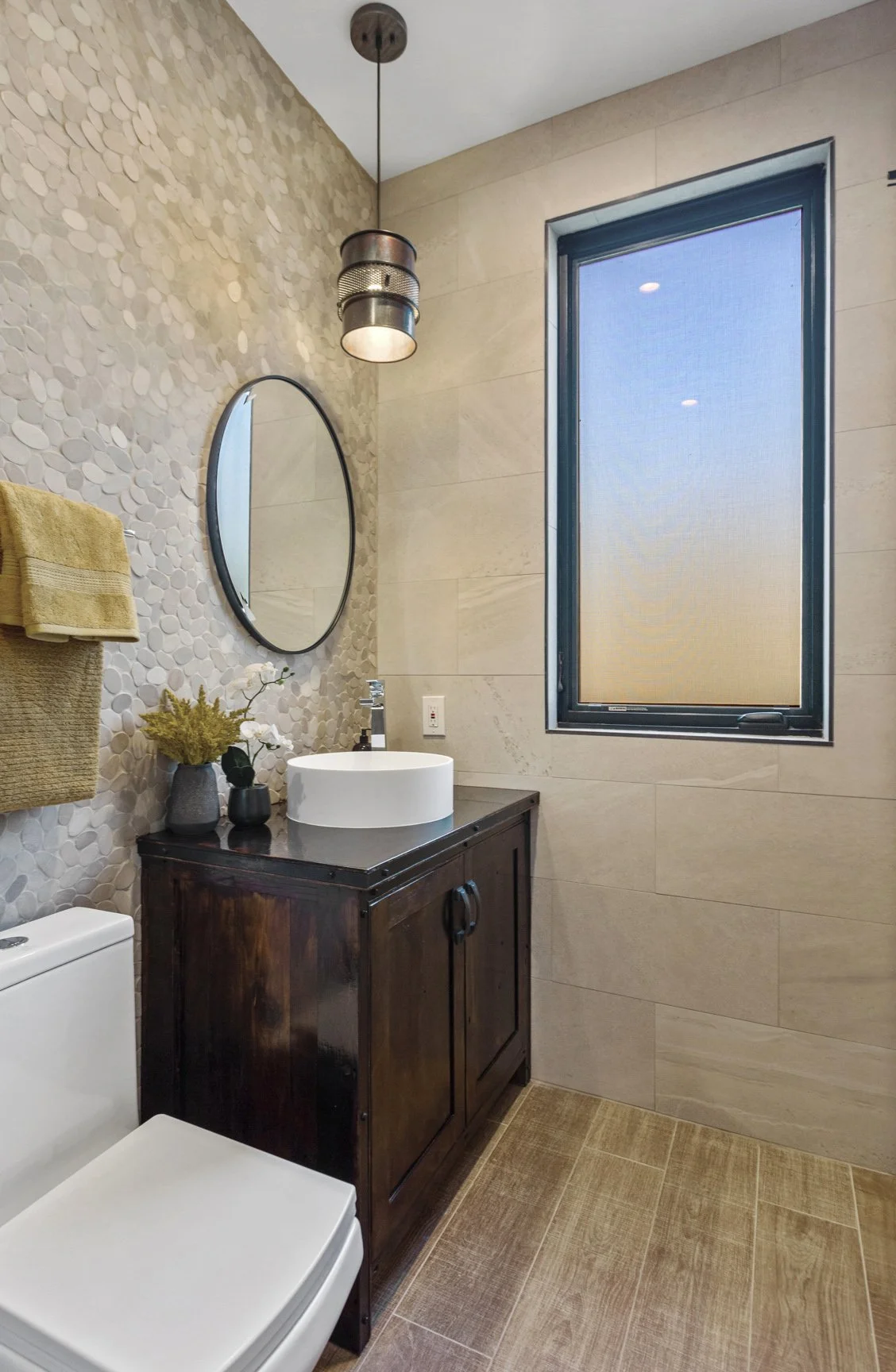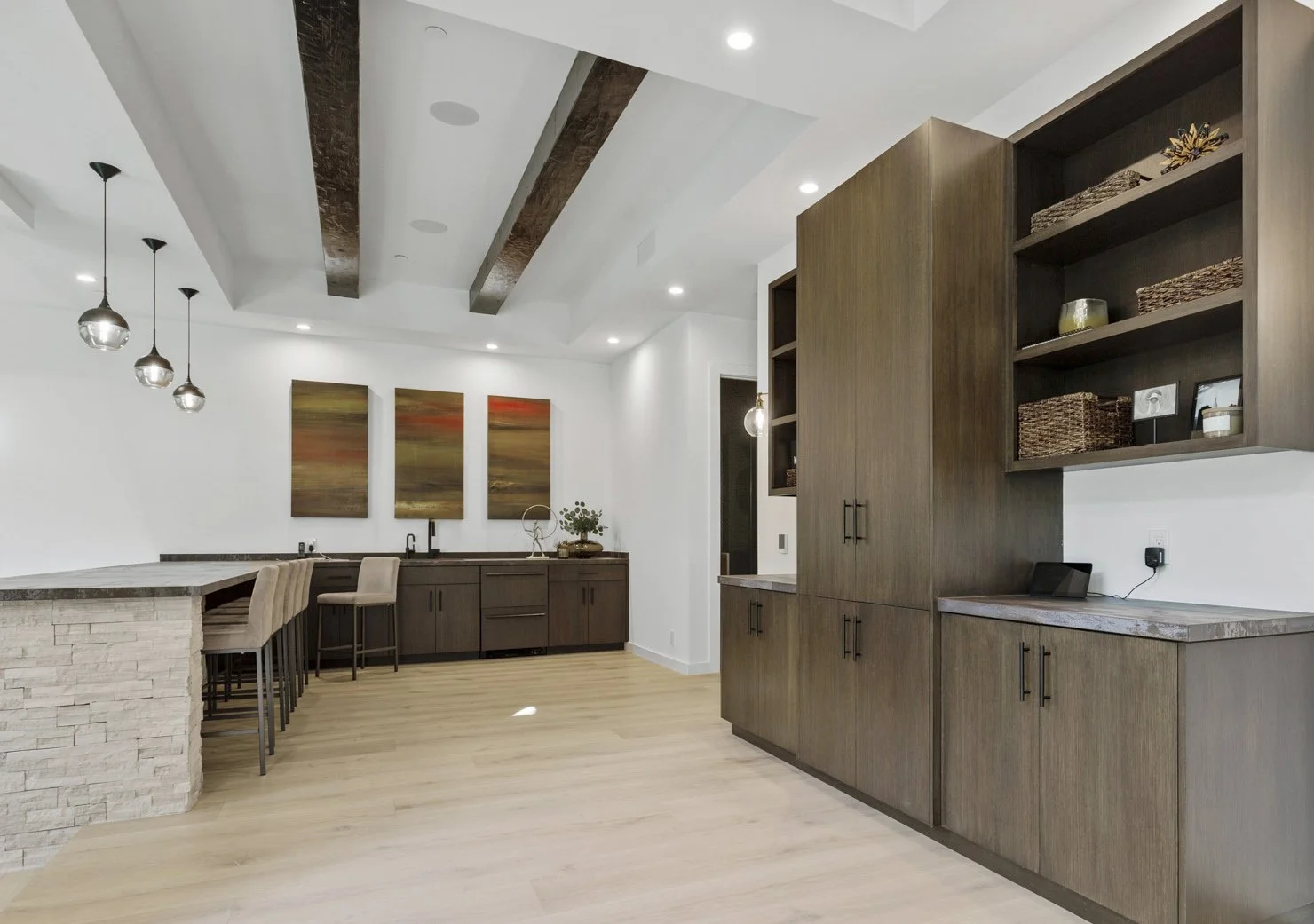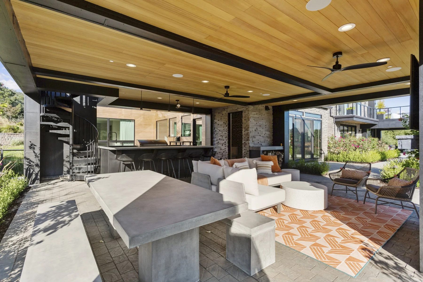 SYLVIA BEEZ CUSTOM-DESIGNED THE KITCHEN AND ALL OF THE 10 BATH- AND POWDER ROOMS, AS WELL AS THE GUEST HOUSE THAT IS LOCATED AWAY FROM THE MAIN HOUSE IN A PARK-LIKE SETTING. FURTHERMORE, SHE DESIGNED THE FIREPLACES, THE MILLWORK, THE BUILT-INS, AND THE LIGHTING, AND CHOSE THE LAYOUT AND SELECTION OF ALL FURNISHINGS, ARTWORK, AND DECOR. FOR THE OUTDOOR SPACES, SHE LAYED OUT AND SELECTED FURNITURE AS WELL AS THE VARIOUS FIRE- AND WATER FEATURES.